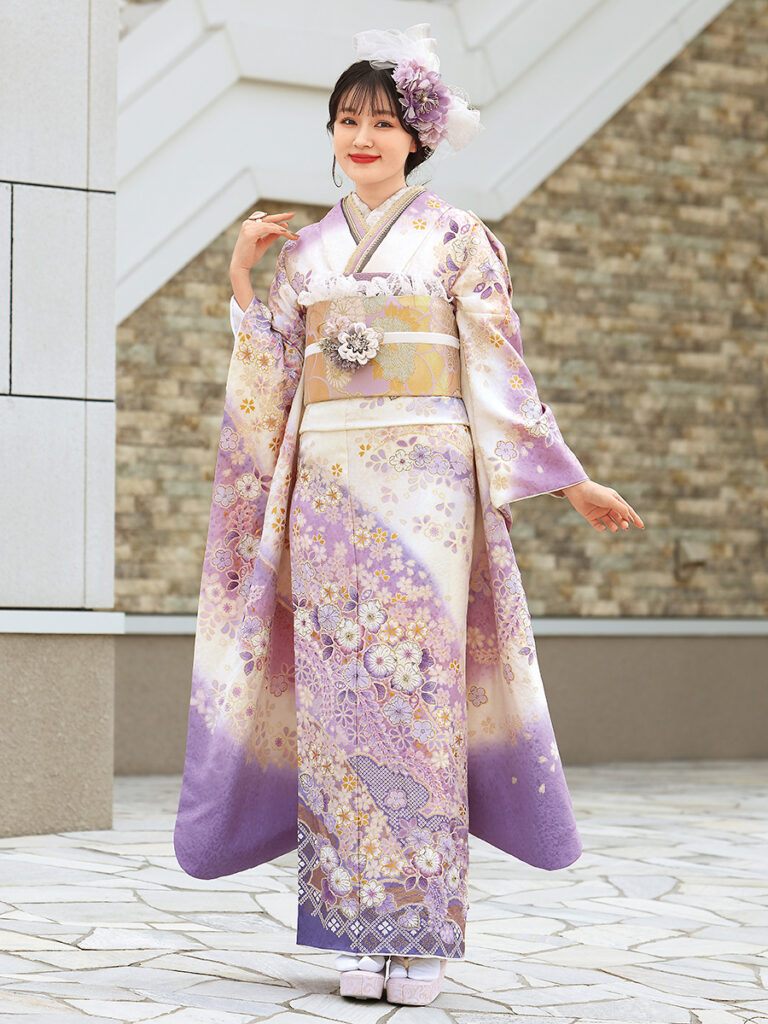 淡いグリーン、くすみピンク、ベージュ、グレーなど、洋服のトレンドカラーが振袖にも取り入れられるようになりました。これらの色は、背景の色との組み合わせ方で様々な表情を見せてくれます。