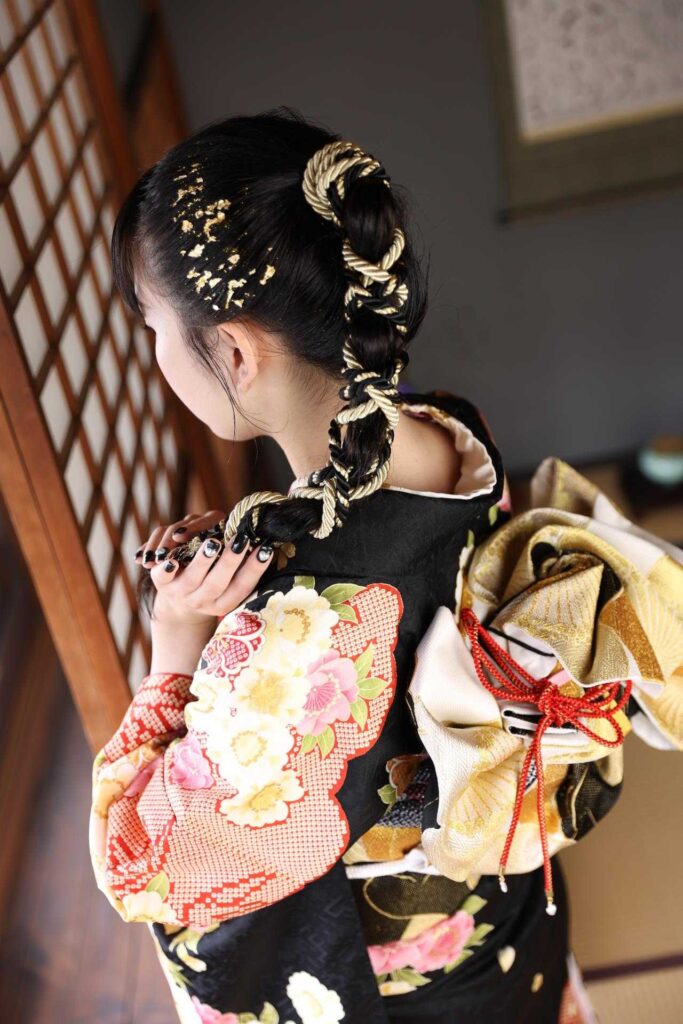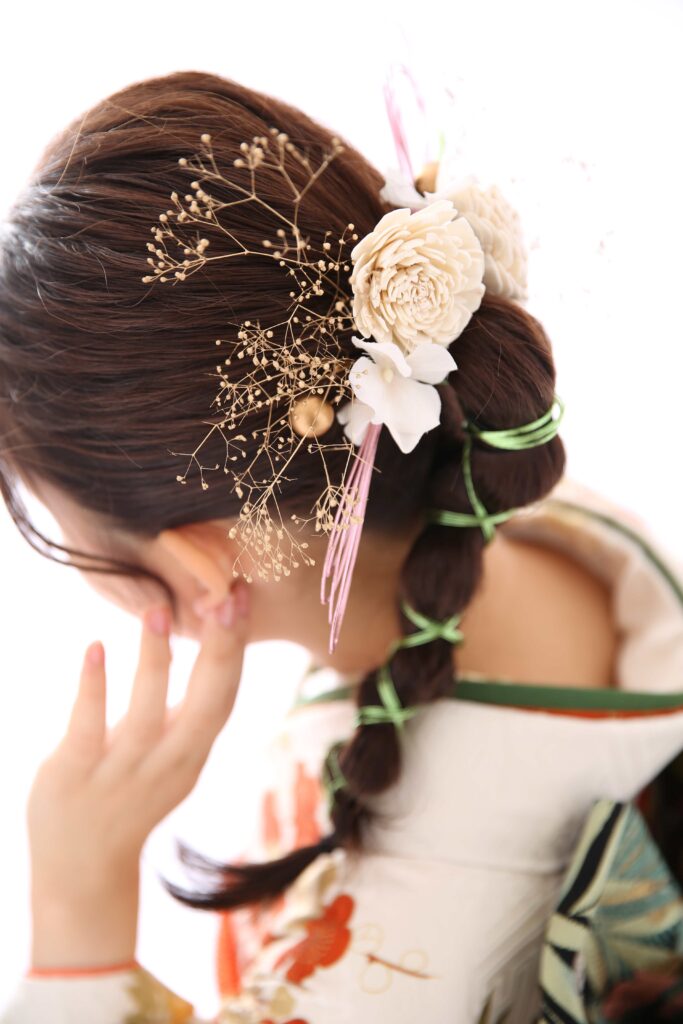 - ポイント: 髪全体に花飾りを散らしたり、編み目に沿って組紐や水引を巻き付けたりすると、動きが出て華やかです。